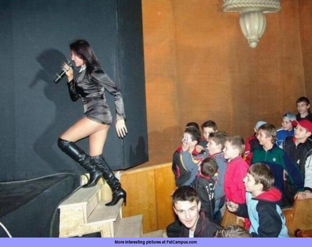 About the picture: a group of boys are enthralled by a leggy performer.